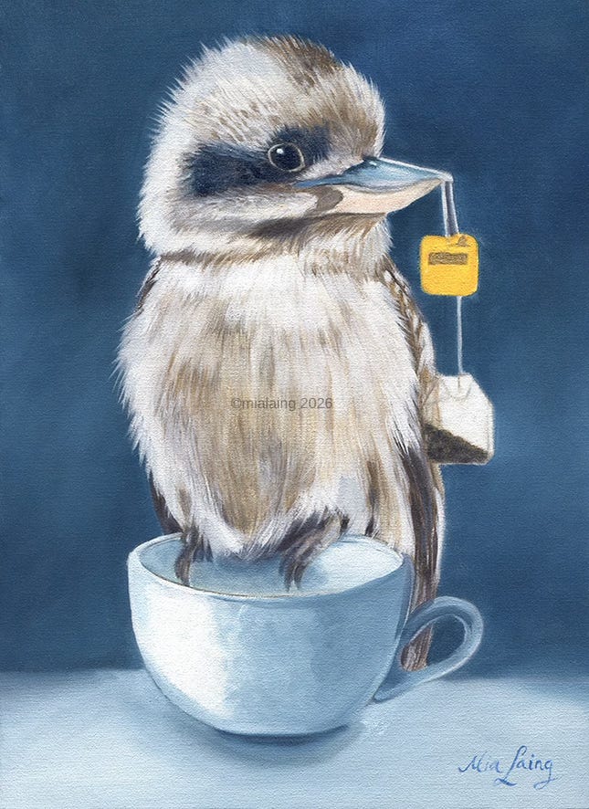 So with this Letter, I present to you my cheeky kookaburra, (various sized paper and canvas prints available here) perfect for popping into a frame and enjoying. May he remind you to take a moment for yourself, to delight in the little things, and to feel confident in your own place at the table. And since every good cuppa deserves something sweet beside it, I’ve tucked in a recipe for a classic tea cake (Below) — a simple, no frills, humble bake and the kind of thing my great-grandmother would have served to her friends at the table.